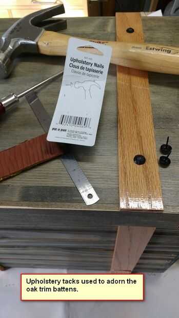 La moldura roble se une con pegamento, clavos y tachuelas decorativas. Las tachuelas de cabeza levantadas se venden como tachuelas de tapicería. Pretaladre el roble para colocar las tachuelas más fácil.