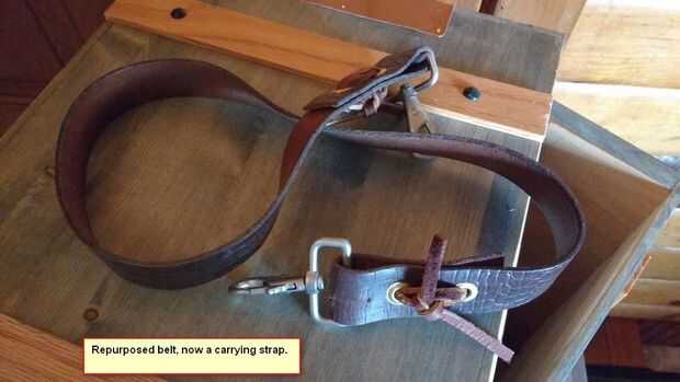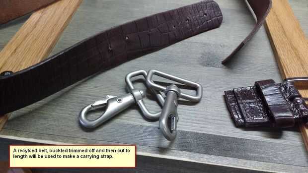 Usé un cinturón viejo, cortar para hacer un asa de transporte. Se corte el extremo de la hebilla, ojales de latón añadido y luego aseguraron con un cordón de cuero. Los agujeros para los ojales fueron hechos con un punzón hueco ¼". Las dos hebillas eran de un viejo bolso de la gimnasia.