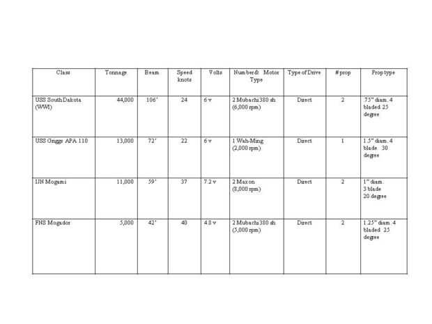 Primero algunos consejos en la selección de motores / pilas para tu nave. Toma algún tipo de propulsión para mover tu nave de guerra por el agua y esta energía es proporcionada por uno o más relativamente pequeño, motores de corriente continua (CC) unidad. ¿Qué tamaño motor es necesario? Bien, la potencia necesaria para propulsar le nave puede definirse como una fuerza suficiente para superar las pérdidas por fricción del sistema. En este caso el "sistema" está conformado por la fricción de los componentes de la unidad y la fricción en el casco, pasando el agua a su velocidad de diseño. Si bien existen fórmulas para la determinación de todas estas pérdidas para un buque determinado, no todos somos ingenieros. Incluso aquellos de nosotros que son mucho más fácilmente a los motores de algunos patrones (preferentemente aquellos con naves de similar tamaño y velocidad) lo que utiliza en qué tensión y qué tamaño y de apoyo. La tabla 3 tiene algunas configuraciones de unidad de ejemplo.