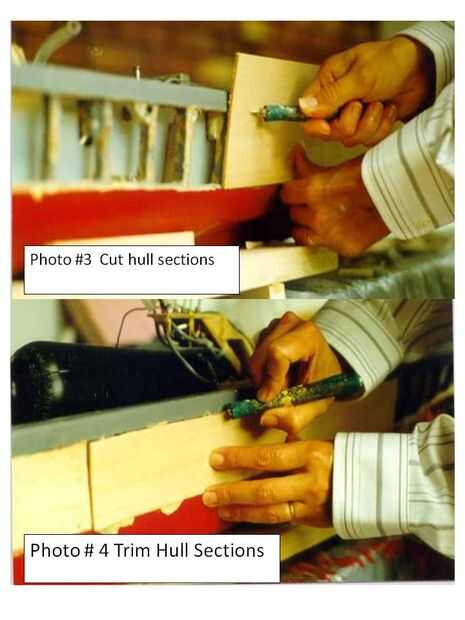 Para el casco de la hoja, instalar laminado en secciones de 8 a 16 pulgadas de ancho para la proa y popa. La sección central se puede hacer generalmente en una sola pieza, pero puede ser cortada en dos, si es necesario. Al final conjunto siempre se produce en un centro de costilla y la veta de la madera debe ir proa a popa, horizontal. Como instalar las secciones desde la popa en adelante utilice un marcador permanente para marcar el caprail donde cada sección comienza y termina. Esto hace más fácil para la reparación de paneles dañados de eliminación. Ahora pone una nueva hoja de balsa sobre el casco y cortar para caber la forma del casco, como se muestra en la figura xx y xx. Esto puede tomar varios intentos para obtener un buen ajuste, cortar así la piel nueva un poco ancho la primera vez. Una vez tienes la hoja cortada para encajar bien en la parte superior e inferior, corte de longitud que termina en el punto central de una costilla. Cuando esto se logra sumergir la balsa en agua tibia durante 5 minutos (generalmente sólo se necesita para las secciones de proa y popa). Retírelo y límpielo. Luego rocíe el interior de la sección de balsa con CA acellerant. Luego cubrir cada costilla y la parte superior y parte inferior del casco los cantos la balsa se comunicará con la gruesa cola de CA. Ahora cuidadosamente la sección de casco en lugar y presiónelo contra el casco hasta que el pegamento seque. Esto sucederá muy rápidamente. Si existen lagunas o vacíos a lo largo de las costuras aplican otra gota del pegamento CA entonces rociar con acellerant. No es necesario llenar el vacío completamente Asegúrese de su sellado. Una vez instalada la sección adelante continuar con el proceso de recubrimiento hasta que todo el casco es nuevo piel. Trabajo generalmente desde la popa (más difícil) al arco.