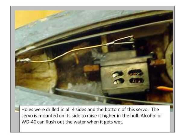 Si usted tiene el lujo de una caja resistente al agua desea rellenar tantos servos en él como quepan.  Para los servos fuera de su caja querrá montar como en el casco como sea posible y hacia abajo si es posible.  Esto les dará más protección contra el agua por lo menos hasta que la nave pasa por debajo.  Un dispositivo de montaje bien es cortar una pieza en forma de "H" de ¼" madera contrachapada o plástico con el espacio entre las"patas"de la"H"lo suficientemente amplia como para adaptarse a un servo.  Ponga el servo en un lado y las otras "patas" para atornillar en el caprail.