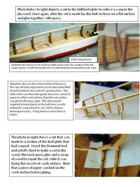 Una vez que el casco se pega (con tachuelas) juntos en este estado todavía será muy frágil así manejar con cuidado, pero no te asustes todavía. A continuación vendrá el fortalecimiento. Coloque el casco sobre una superficie plana e inspeccione cuidadosamente para ver si el casco ha desarrollado una deformación. Si tan sólo rompe algunas uniones de pegamento para aliviar la presión, y luego pegarlos de nuevo. También necesitará hacer unos cortes en la placa base o caprail para aliviar la presión para eliminar la deformación. Encontrarás fotos de este paso comieron al final de este artículo. Hacer tantos cortes como sea necesario para sacar la urdimbre. Una vez más, no te preocupes, no estás debilitando su casco permanentemente.
