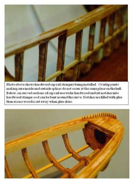 El fortalecimiento del casco comienza ahora. En cascos de madera instalación tiras de madera (abeto) el espesor de la chapa de balsa permitido (1/16 a 1/8 de pulgada). Estos largueros será 3/8" ancho. Este ancho permitirá que la franja se superponen las costillas por 1/8", ya que la madera caprail es solo ¼" de espesor. Estas tiras están instaladas alrededor de la caprail en el interior y exterior del casco. Usted puede cortar los largueros en secciones más cortas, pero asegúrese de que los empalmes están escalonados y el interior larguero común no se produce en la misma costilla como el larguero exterior. Instalarlos nuevamente en la proa y la popa es la parte más delicada para llevar a cabo. Para permitir que la madera dura doblar alrededor de las áreas curvas corte muescas alrededor de 2/3 Aunque el larguero de madera sobre cada ¼" en el interior la parte que estará al lado del casco, y luego doblar el larguero hasta que las grietas en las muescas. Usar la herramienta Dremel y cortar para hacer las muescas de la rueda.