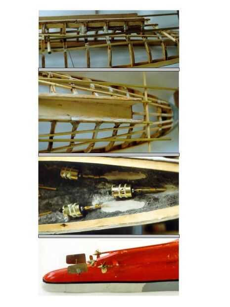 La tercera foto muestra cómo el sobre tamaño de agujeros en un casco de fibra de vidrio fueron llenados con masilla epoxi. También muestra el ángulo extremo en el acoplamiento para los motores que era necesaria para permitir que el cañón entre los motores. Como resulta, el motor de centro estaba todavía en el camino del cañón de popa y tuvo que ser retirado y "hacia atrás" instalado sobre el tubo de embalaje utilizando una junta tórica o engranaje. Los motores son instalados por colocar pequeñas secciones de tubo de cobre para el casco con resina epóxica y luego deslizarse lazos de alambre plástico a través de los metales y en los motores. Se trata de un sistema que ha demostrado que funciona muy bien.