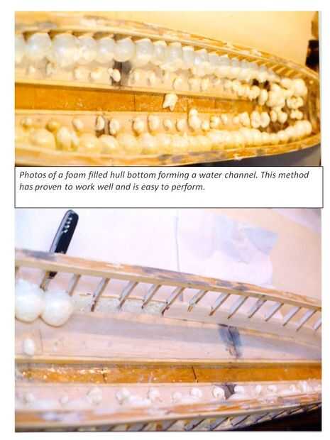 Luego instalé un trozo de balsa sobre las costillas entre el larguero del canal de agua y las costillas del lado de la nave como se muestra en las fotos que lo acompaña. Desde la parte de las costillas que estaban pegados a la placa de quilla casco estaban inclinadas hacia el centro, que esto permite que cualquier agua que entra por los agujeros en los lados en el canal de agua y la bomba. Luego perforé un agujero en la hoja de balsa entre cada costilla y utilizando una lata de espuma en aerosol expansión mínima "Grandes cosas" llena cada sección de la costilla con la espuma. Mi primer intento en esta hace varios años la espuma simplemente forzada la balsa, agrietarse en pedazos. La muestra de fotos que acompaña como mínimo de expansión de espuma aún se expande considerablemente (hay algunas nuevas espumas muy mínima expansión en el mercado algunos y experimentan). Los espacios entre las costillas fueron solamente 2/3 llenadas!