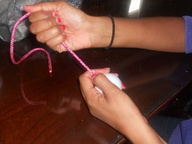 4) Coloque la cuerda por los agujeros de las bolas de golf.