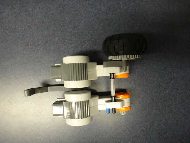 Tomar los productos terminados de los pasos 10 y 8. Tomar una de las ruedas conectadas a la pieza en forma de L. Conecte el lado más largo de la pieza en forma de L para los acoplamientos azules y negros del producto de paso 10. La pieza azul se conectará con el agujero transversal de la pieza en forma de L y el acoplamiento negro pasará por el orificio junto a la Cruz. El producto final se verá como la foto. Repita esto para la otra rueda. El pequeño engranaje conectado al círculo naranja se conecta con el engranaje grande conectado a la rueda. Después de terminar con este paso, el cuerpo del robot está ahora completado.