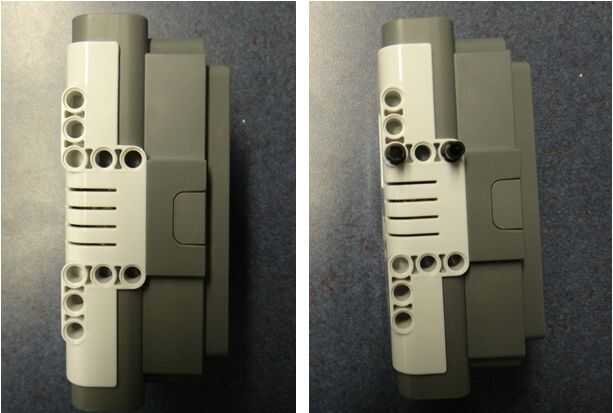 Tomar el ladrillo NXT y cuatro acoplamientos negro pequeño. Poner el ladrillo en su lado como lo que se muestra en el lado izquierdo de la foto. Tomar los acoplamientos negro y colocarlos en los agujeros primeros y terceros que se encuentran en una línea horizontal a usted como el ladrillo es lugar como en el lado izquierdo de la imagen. El producto final debe parecerse a la derecha de la imagen.