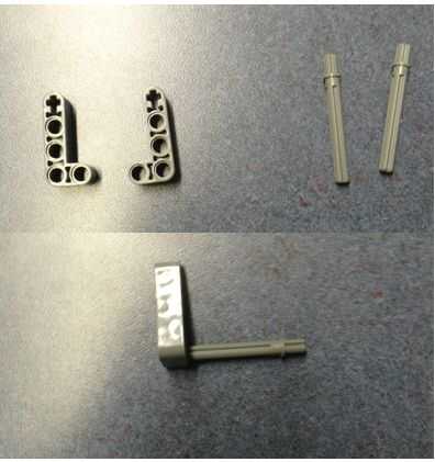 Tome dos de las piezas en forma de L con cinco agujeros y las piezas gris más oscuras con el puente como se muestra en la mitad superior de la foto. Coloque el lado más largo de la pieza gris oscuro a través del primer agujero en el lado más corto de la curva. Esto se verá como la parte inferior de la mitad de la foto. Empuje la pieza gris oscurezca hacia el puente.