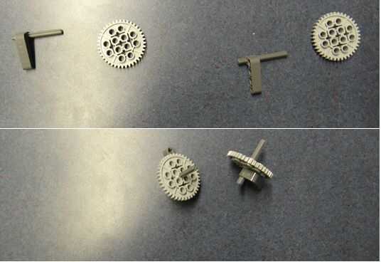 Tomar el producto terminado del paso 5, así como los grandes engranajes gris mostrados en la mitad superior de la foto. Pegue el extremo largo de la pieza gris oscuro grande a través del centro Cruz hoyos en el engranaje. El equipo debe estar en el mismo lado del puente que la pieza en forma de L. El producto Final de este paso debería verse como la parte inferior de la mitad de la foto.