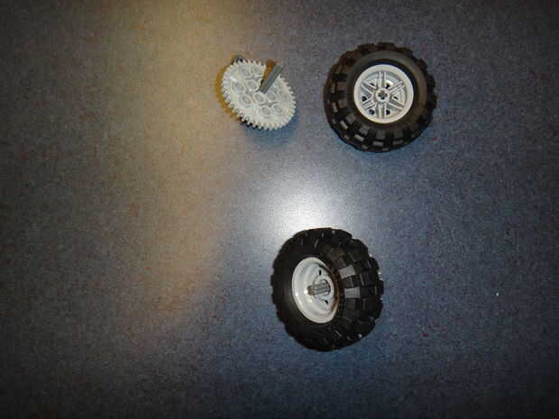Tomar los productos terminados desde el paso 6 y los neumáticos. Inserte la pieza acabada del paso 6 en el centro de la Cruz de agujero en la llanta. El neumático debe estar en el mismo lado que el engranaje y pieza en forma de L. El producto final debería verse como la foto de arriba.