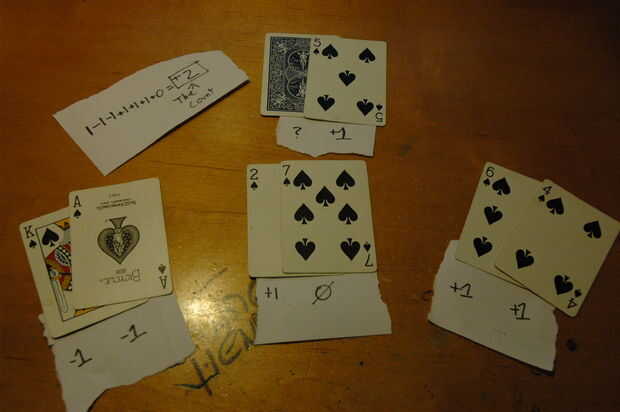 Por ejemplo: Si un as, rey, 2, 7,6,4 y 5 son tratados, el recuento es + 2