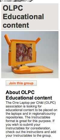 Para hacer esto, necesita primero ser un miembro del grupo. Bajo el encabezado explorar, haga clic en grupos, encontrar el grupo OLPC y haga clic en él. O bien, haga clic aquí. Una vez en el grupo, haga clic en el botón join. Ahora, puede agregar cualquiera de su Instructables al grupo haciendo clic en el enlace "Añadir este instructable para un grupo" en la barra lateral izquierda al ver el Instructable.