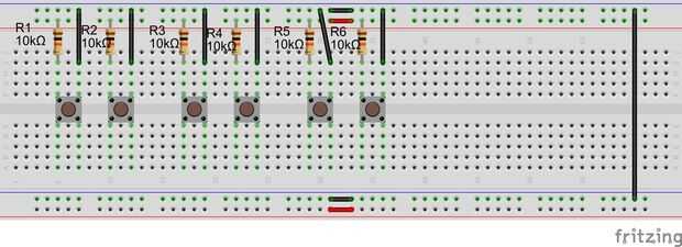 Las resistencias conectarán del interruptor de botón del Pin 3 a la línea de 5v de Arduino, y los cables negro conectan el Pin 1 del interruptor pulsador a tierra, completando el circuito. Para los cables de tierra, no utilice los cables de puente macho/macho, pero en su lugar utiliza algún alambre de cobre delgado y aislado que tenía por ahí, lo hice para que los cables no demasiado sucios, pero si no tienes cualquier cable de repuesto, los cables de puente macho/macho funcionará bien.
