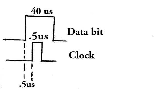 PIN 7 en el Chip de interfaz es la entrada para el bit de datos. Cuando el perno es bajo es un cero bits de datos. Cuando el pin está alto es un bit de datos. El microcontrolador debe de salida de los bits de datos antes del pulso de reloj. El bit de datos debe ser al menos 40 Estados Unidos largo.