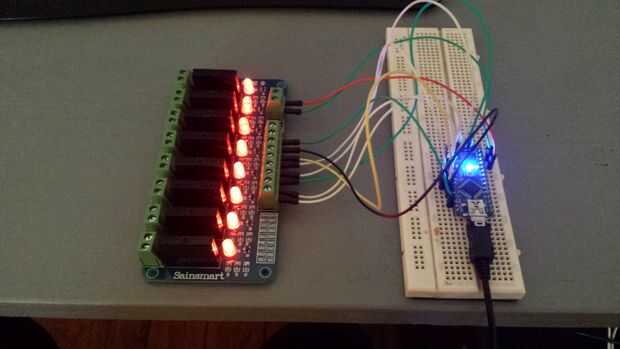 Si todo va bien, prueba todas las salidas, ahora simplemente conectando un 220 Ohmios resistencia de un Led, donde la negativa llevó la pierna va al pin Arduino Grd mientras que el positivo va a la salida de prueba. Como alternativa, puede conectar el tablero SainSmart 8 SSR para el Nano para un test de end-to-end rápido, seguir el diseño general en el paso 1, puede utilizar los cables de puente para hacer su vida más fácil al conectar el Nano la SainSmart.