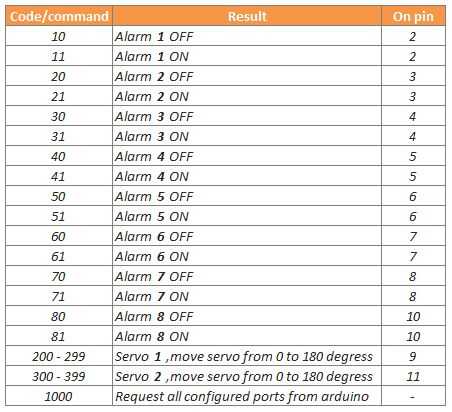 -Envío de 1000 volverá atrás lista de todas las alarmas definidas en Arduino y su pin asignado, separados por un punto y coma;