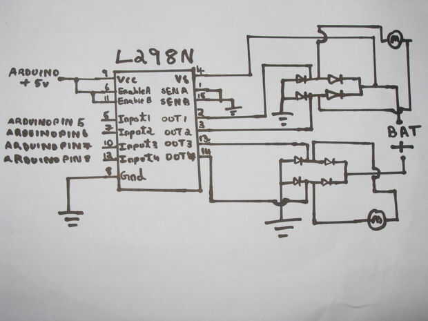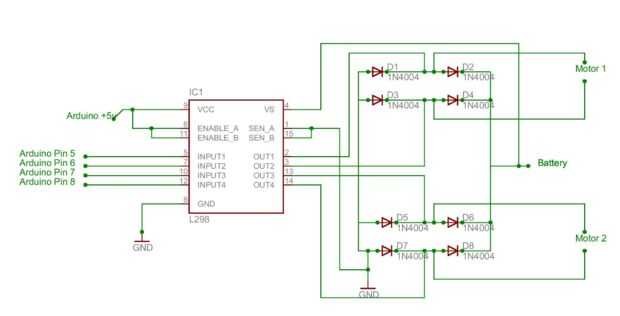 Estaba siendo el principio básico de un puente en H capaz de controlar la dirección del motor, es decir, hacia adelante o hacia atrás. Esto se logró al administrar el flujo de corriente a través de elementos de circuito como transistores. La formación se ve como una H y es donde se pone su nombre – puente en H. El L298 utiliza este principio para controlar los motores.
