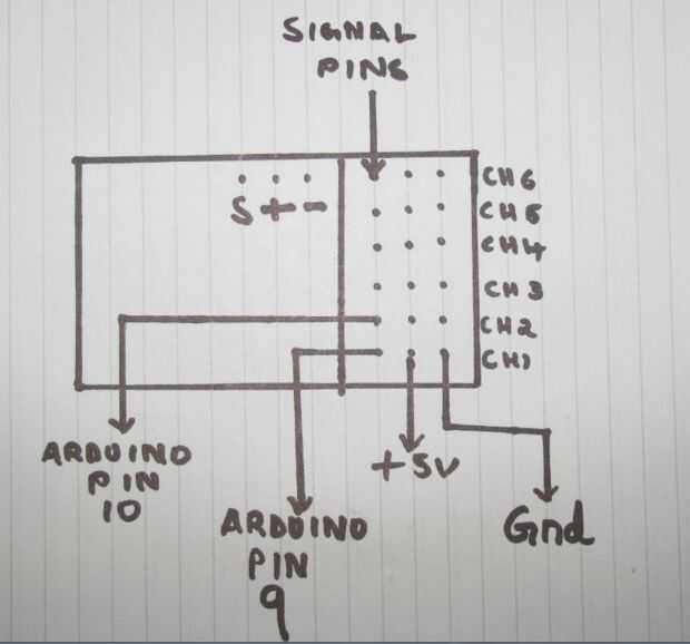 Conectar los dos canales del receptor que desea utilizar para los pines de arduino 9 y 10.