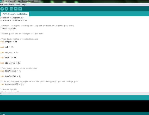 Este es el programa que escribí. Envía subir señal un volumen cada vez que la perilla sea girada hasta un volumen hacia abajo cuando la perilla hacia abajo, un volumen por señal cada pocos milisegundos mientras que el volumen botón se presiona y el indicador LED se ilumina cuando está enviando señales.