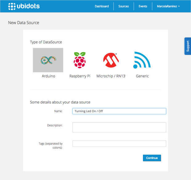 Una vez estás en tu cuenta ve a la pestaña "Sources" y presiona clic en "Agregar nuevo origen de datos", selecciona Arduino y dale el nombre gustes. Abre tu nuevo "Data Source" y presiona en "Agregar nueva Variable", elije el icono de tu preferencia, dale un nombre y escribe las unidades estés usando en tu proyecto.