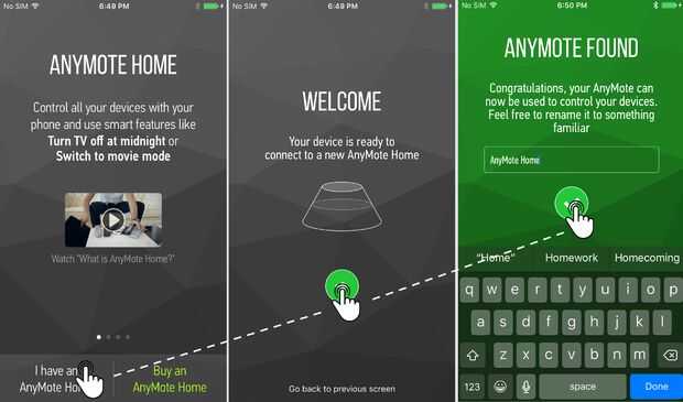 En el primer lanzamiento de la aplicación AnyMote control remoto inteligente, verás un breve presentación slideshow. Toque la tengo una casa de AnyMote el botón en la parte inferior de la pantalla y luego pulse el botón redondo con una flecha en él para iniciar el proceso de sincronización. Tan pronto como maridaje es completa, usted tendrá la opción de cambiar el nombre de su AnyMote algo reconocible.