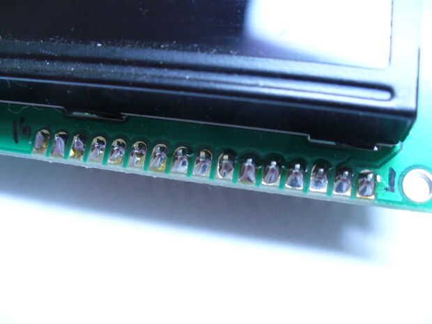Para hacer la pantalla LCD fácil de trabajar en la protoboard se suelde el hombre encabezado al paquete LCD. Estos LCD suelen tener 14 datos pernos y 2 para la retroiluminación LED. Así que le coloque un trozo de 16 pines del cabezal de y soldadura en cada uno de los agujeros de 16.