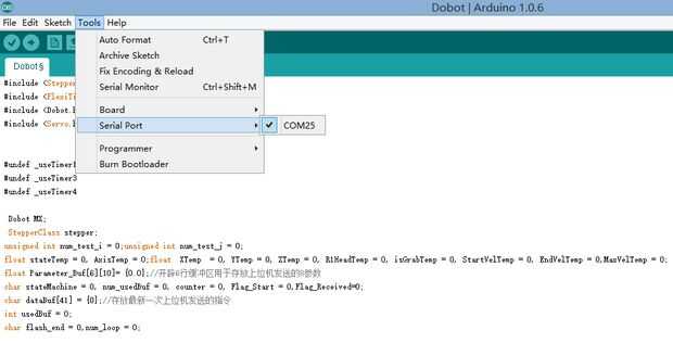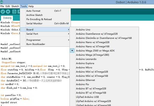 Conectar el Mega 2560 con el ordenador. Antes de subir el archivo .ino en mega2560, debe poner la biblioteca Arduino de Dobot brazo a su carpeta de la biblioteca arduino y vuelva a abrir el IDE de arduino. Abra el Dobot.ino con el IDE de Arduino. Elegir el Mega2560 del tablero en la columna de herramientas y el derecho de puerto Serial el Serial grifo. Ahora, puede cargar el dobot.ino en su tablero mega2560.