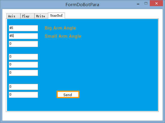 Basado en las mediciones de ángulo del robot en el segundo capítulo, escribe los grados de ángulo de comienzo de las grandes y las armas pequeñas que previamente medido en la sección de UserDef (por defecto, la voluntad de grandes y pequeños brazos restablece sus ángulos a 45 grados cada vez se reinicia). Haga clic en "Enviar".