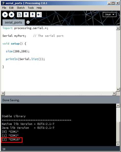 OK es extraño, procesamiento directamente no funciona con el número de puerto COM, pero con una otra numeración. Si el puerto serie es 1, el número de tratamiento es de 0. COM 2 -> número de proceso 1... En mi caso, COM16 es el número 2. (En caso de problemas, cargar y ejecutar el boceto adjunto "serial_ports.pde" en el proceso de buscar puertos seriales existentes.)