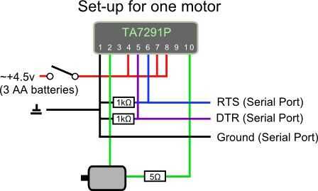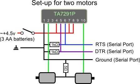 a continuación necesitamos hacer el circuito. Es una conexión de puente de motor simple. El único problema es que TA7291P necesita 4.5v para operar, pero los motores son de 3v. Hay dos formas de solucionarlo: obtener motores de mayor tensión o poner en un resistor para limitar la corriente. La resistencia tendría que ser de 2 - 5Ω con alta potencia (2w o más). Sin embargo Si compraste resistencias de 1/4 watt a granel (como hice yo) puede puede poner bastante en paralelo para dividir esa potencia ya que ocho resistencias de 1/4 watt pueden tomar 2w. Desde resistencias en paralelo dividen su resistencia, resistencias de 20 en 100Ω = 5Ω (como 10 resistencias en 50Ω). Eso es un montón de resistencias, pero en unos $0,02 cada uno, que comprar una resistencia de 2w extra. Puedes ver mi racimo de resistencia 100Ω en la foto. No necesita el interruptor que he puesto en el circuito, pero a veces las clavijas de la serie se fijan a alto cuando el USB se enciende que hará que tu motor rev antes de que su programa puede poner en marcha y los apaga.