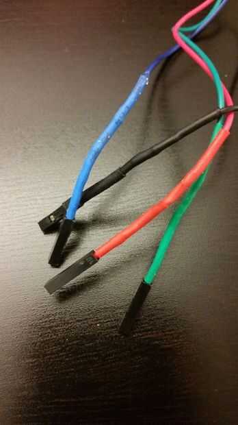 Intentó cortar solo macho a hembra encabezados de un conjunto más amplio, pero terminó haciendo un lío, así que me di por vencido. Lo más fácil para mí era cortar los extremos de cables MTE, soldarlos a los cables, y luego abrigo del encogimiento la soldadura en el color del cable. El abrigo del encogimiento es para que la soldadura es segura, tanto para que los cables son del color correcto al final.