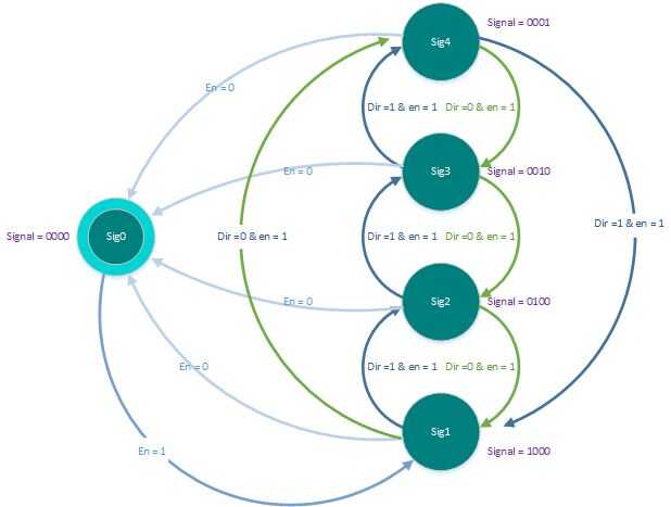 Sabía de mi investigación, que para conducir el motor paso a paso en completa el modo de paso, tenía que activar una bobina a la vez, esto significó un cable debe conducir el alta en un tiempo. Así, en cada uno de mis estados activos, Sig4, Sig3, Sig2 y Sig1, la salida es señal, que contiene la señal a cada uno de los cables. En cada uno de estos Estados es impulsado por una única señal. Esto significa que una de las bobinas estarán activa.