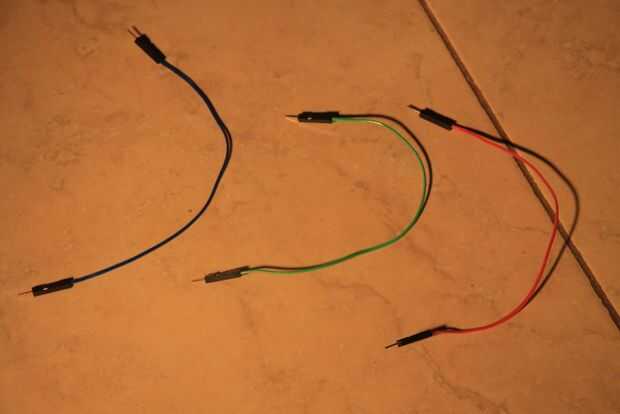 Ahora para la diversión parte. Conecte tres cables de puente a los pines del LED rojos, verdes y azules. Utilicé los cables del puente del mismo color como los pines que me conectarlos.