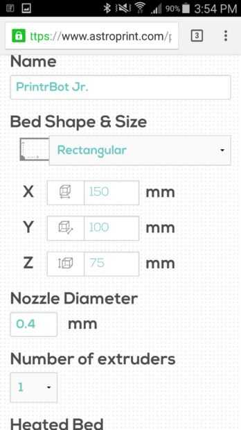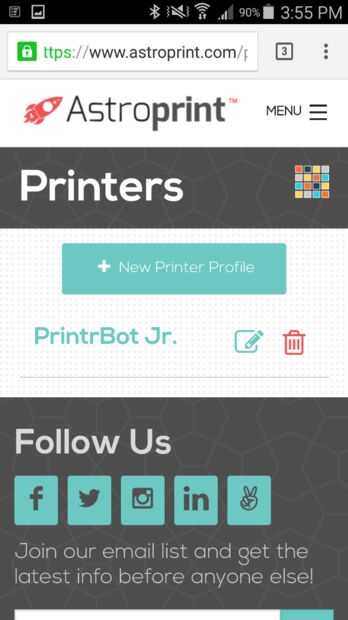 Con el teléfono conectado todavía a lo AstroBox, vaya a la página de configuración pulsando el icono de engranaje en la parte inferior de la página. Cuando se abre la ventana de configuración, debería ver un mensaje que le informa que no hay ninguna impresora conectada a la AstroBox.