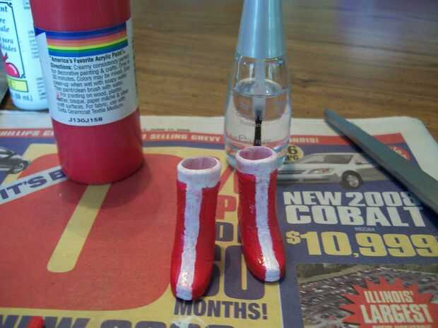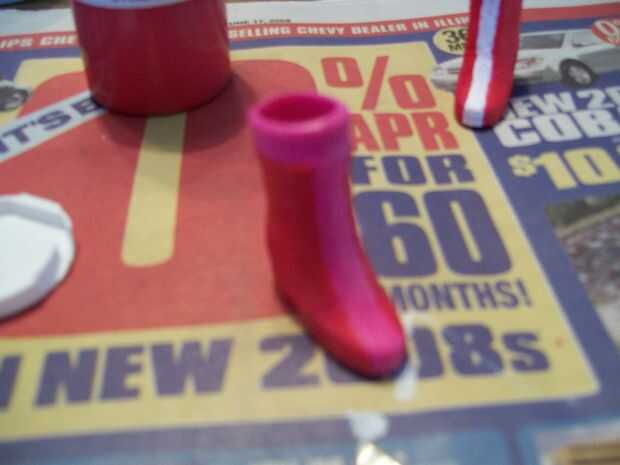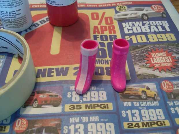 Para las botas, usted necesita encontrar ya hecha muñeca o botas de Barbie. Los que encontré eran botas rosa, no absolutamente tan alto como yo quería, pero que trabajaron. En primer lugar, con cinta de enmascarar, la máscara de una raya hacia abajo el frente y alrededor del borde superior. Pintar el arranque con let y pintura acrílica seca. Retire la cinta y la máscara del área a ambos lados de la raya. Rayas de pintura blanca. Para sellar el arranque, use capa superior clara para modelos o esmalte de uñas capa superior.