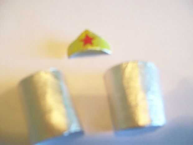 La tiara que hice fue hecha como las pulseras. Tomé un pedazo de tubo de papel higiénico 2,3 cm de largo con la curva y 1 cm de ancho. Decidí hacerlo señalado sólo en la parte superior en vez de puntas a ambos lados. Luego dibujó y cortar curvas viniendo hacia abajo desde el punto de centro así que el los extremos fueron unos 0,5 cm de ancho. Entonces cubierto con papel de aluminio y de color con un marcador permanente amarillo. Si puede, utilice la hoja de oro. Para la estrella roja, empecé con un rojo gummed estrella. Era demasiado grande para mi tiara pequeña, así que dibujé en la parte posterior de él una estrella más pequeña para cortar y pegar en. (No se pegan con saliva). Mi tiara puede ser presionado en el pelo y la estancia bastante bien sin asociar ningún mini peines ni nada, pero quizá quieras.