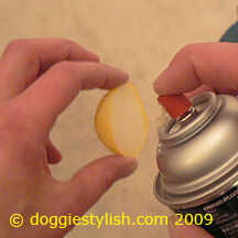 Coloque la capa del traje de diario. Esta parte es probablemente la messiest! Tienes que tomar cada medio círculo individual y rociar con una buena cantidad de pegamento. Ahora coloque el medio círculo, el lado plano hacia abajo en la tela amarilla. Repetir este proceso hasta cubre toda la tela amarilla con "niblets". Ahora necesita secar el pegamento, solo colocarla en una caja abierta. Será suficiente una hora para secar.