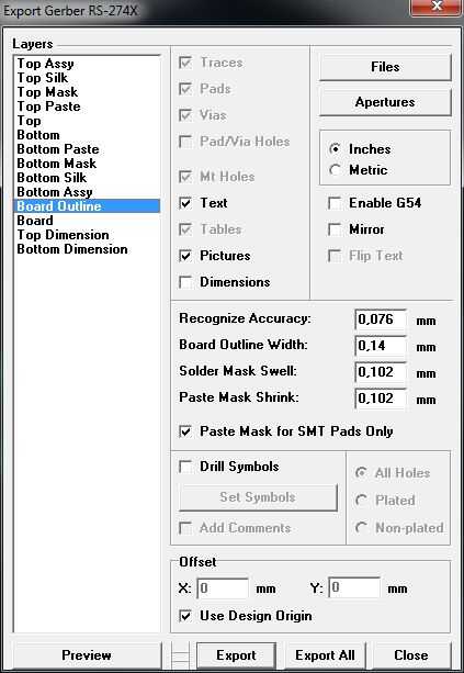 Seleccione Contorno de placa y haga clic en exportar eligió sí utilizar la aberturas automáticamente y guardar el archivo, por ejemplo. "BoardOutline.gbr"