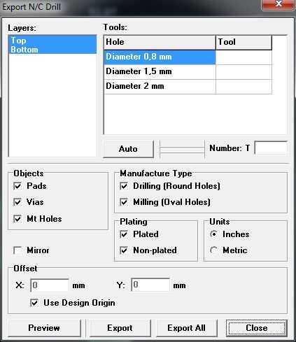 Compruebe la configuración y haga clic en exportar eligió sí utilizar las herramientas automáticamente y guardar el archivo, por ejemplo. "Through.drl"