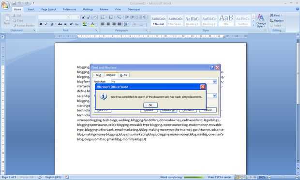 Y, una cosa más. Después de que golpeó el botón "Reemplazar todo" MS Word te dice cuántas veces realizó la operación. Pero también te dice cuantas palabras tienes realmente.
