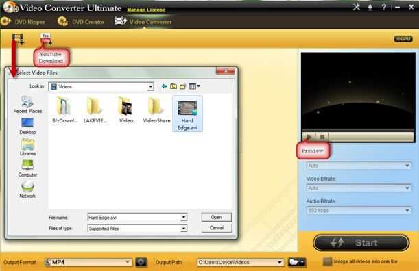 Después de descargar, instalar el programa, ejecutarlo y luego haga clic en el botón "Añadir" para cargar videos AVI a AVI al convertidor del iPhone 5s. O puedes pulsar el botón "Descargar YouTube" para añadir vídeos AVI directamente descargando desde sitios web compartir video como YouTube. Y también puede ver vídeos en la ventana derecha.