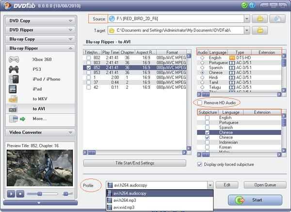 A continuación, seleccione los títulos de película que desea copiar (puedes escuchar el título resaltado antes de cortar al hilo en la esquina inferior izquierda), comprobar la secuencia de audio/subpicture prefiere. En este ejemplo, estamos rasgando Title852. (Véase la ilustración de abajo)