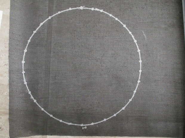 Cuando el círculo esté completo, marque la ubicación de los orificios. Lo general una pulgada o pulgada y media es suficiente. como usted tiene un número bastante par. ésos son va a ser perforada por el tubo que pasar utilizando el cuero punch/scredriver/cuchillo, o lo que vas a utilizar.