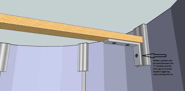 4 después de que usted tiene los soportes en L en posición (enfrente de uno a), coloque la barra de aluminio en la parte superior, asegúrese de que si la cabeza está montada, tiene suficiente espacio libre para el piezo, además un poco rizer de piezo (sobre una pulgada o 2 debajo de la cabeza). Si no tienes suficiente espacio libre como en un tambor, hacia los soportes en L los titulares de estirón de fondo.