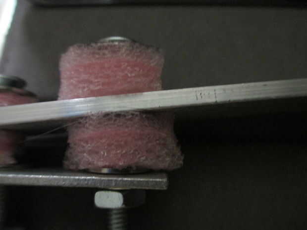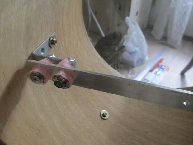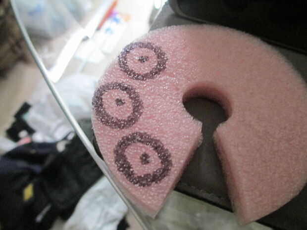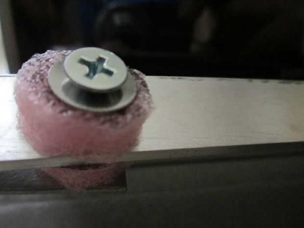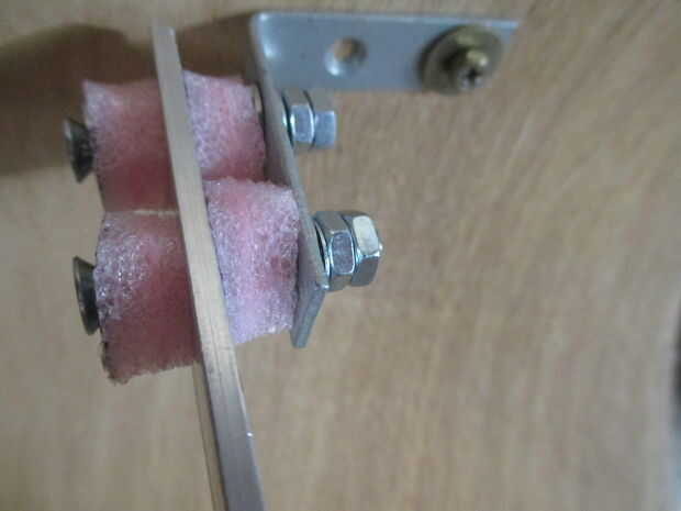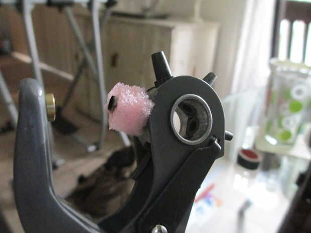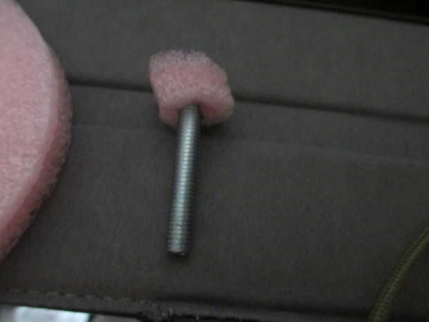 El material esponjoso rosa es de un huso de CD que utilicé para aislar la cabeza piezoeléctrica del resto del tambor. Usted puede utilizar arandelas de goma pero encontré demasiado duro y no es bueno para el aislamiento.