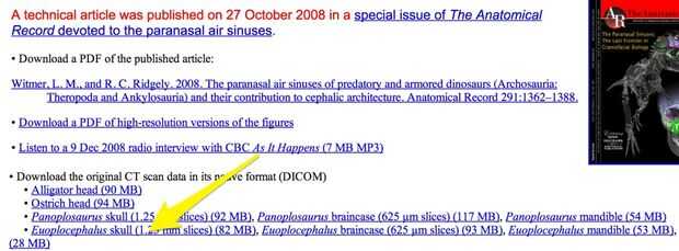 Para los efectos de este ejemplo, estoy usando el Euoplocephalus cráneo de Witmer laboratorio en la Universidad de Ohio. Descárgalo aquí y descomprime el archivo .zip.