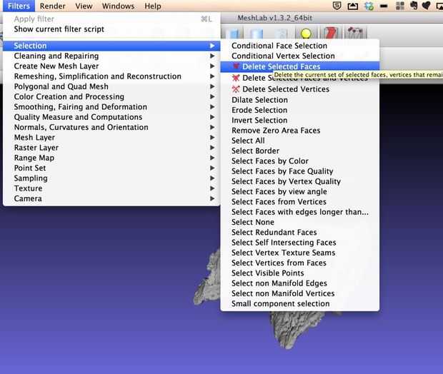 Para limpiar los pedacitos sueltos, girar el modelo para que las piezas sueltas no se superponen a cualquier parte del cráneo, utilice la herramienta selección rectangular para seleccionarlos y borrarlos desde el menú de filtro.