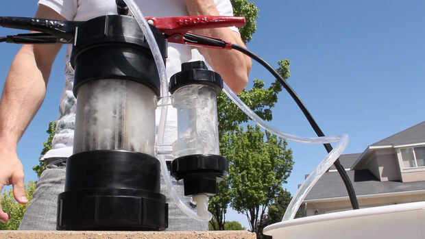 Con 12 voltios, esto produce aproximadamente 1,5 LPM. ¡ Enganchado también a 2 baterías de automóviles en serie, y en este mayor voltaje 24, el sistema produce más de 5 LPM y llenó una jarra de leche de galón en 38 segundos!