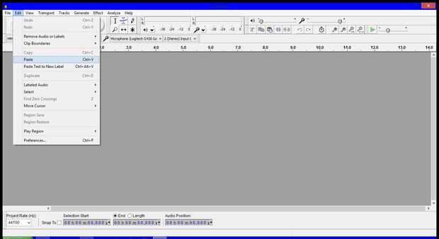 Abrir una nueva ventana de Audacity (menú Archivo -> click en "Nuevo", en quinto lugar de la imagen) y haga clic en "Editar" en la ventana. Haga clic en "Pegar" (sexta imagen) desde el menú que aparece. Ahora tendrás la primera canción separada del resto. Exportar la misma manera como lo hizo con los dos archivos grandes de audio.